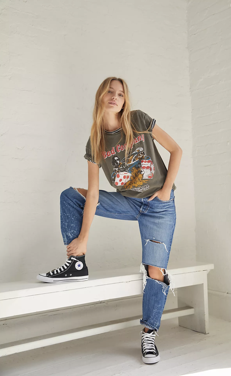 Фасон может быть любой, и цвет одежды можно выбрать как светлый, так и темный — с чёрными кедами Converse образ станет более стильным.